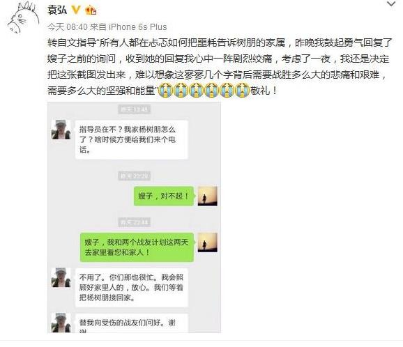 今天早上八点左右,袁弘在微博晒出了杨树朋战友与其家属的聊天记录,聊天中这位战友在杨树朋妻子询问杨树朋何时回家时,久久未回微信,几经踌躇后才回了一条,“嫂子,对不起!”而此时已经从其他途径得知噩耗的妻子却显得非常坚强,“我会照顾好家里人的。放心。我们等着把杨树朋接回家”短短几字非常催泪。难以想象家里的天塌下来的感觉,这样一位弱女子是以怎样的心态去承受的。袁弘还转发了这位战友的微博原文,“考虑了一夜,我还是决定把这张截图发出来,难以想象这寥寥几个字背后需要战胜多么大的悲痛和艰难,需要多么大的坚强和能量”。