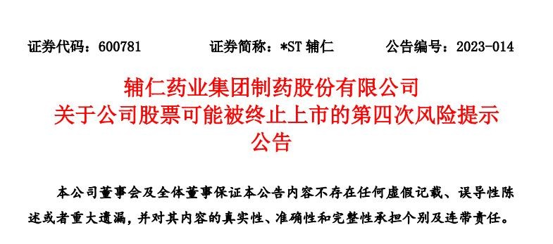 辅仁药业发布公司股票可能被终止上市的第四次风险提示公告