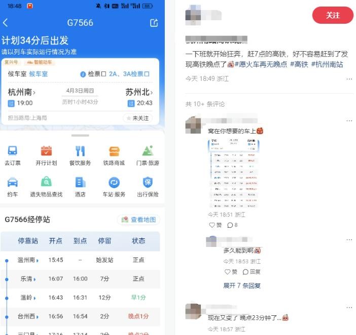今晚,有网友发帖称:“下班紧赶慢赶地来杭州东站,结果高铁晚点了……从晚10分钟开始,到现在晚50分钟……”