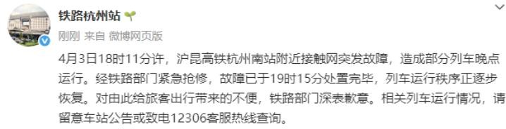 刚刚,“铁路杭州站”微博回应:4月3日18时11分许,沪昆高铁杭州南站附近接触网突发故障,造成部分列车晚点运行。经铁路部门紧急抢修,故障已于19时15分处置完毕,列车运行秩序正逐步恢复。对由此给旅客出行带来的不便,铁路部门深表歉意。相关列车运行情况,请留意车站公告或致电12306客服热线查询。