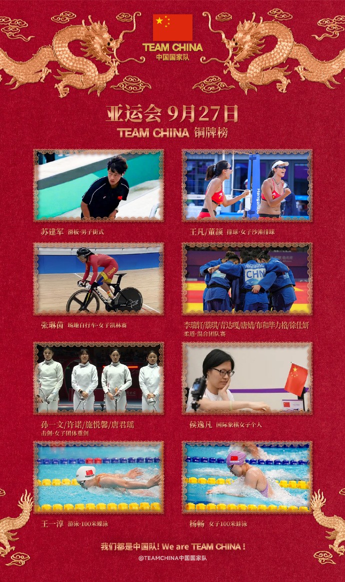 亚运奖牌榜:截至9月27日,中国队共获得76金43银21铜,位居奖牌榜榜首