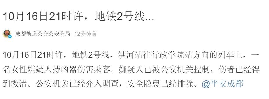 10月16日21时许,地铁2号线,洪河站往行政学院站方向的列车上,一名女性嫌疑人持凶器伤害乘客。嫌疑人已被公安机关控制,伤者已经得到救治。公安机关已经介入调查,安全隐患已经排除。