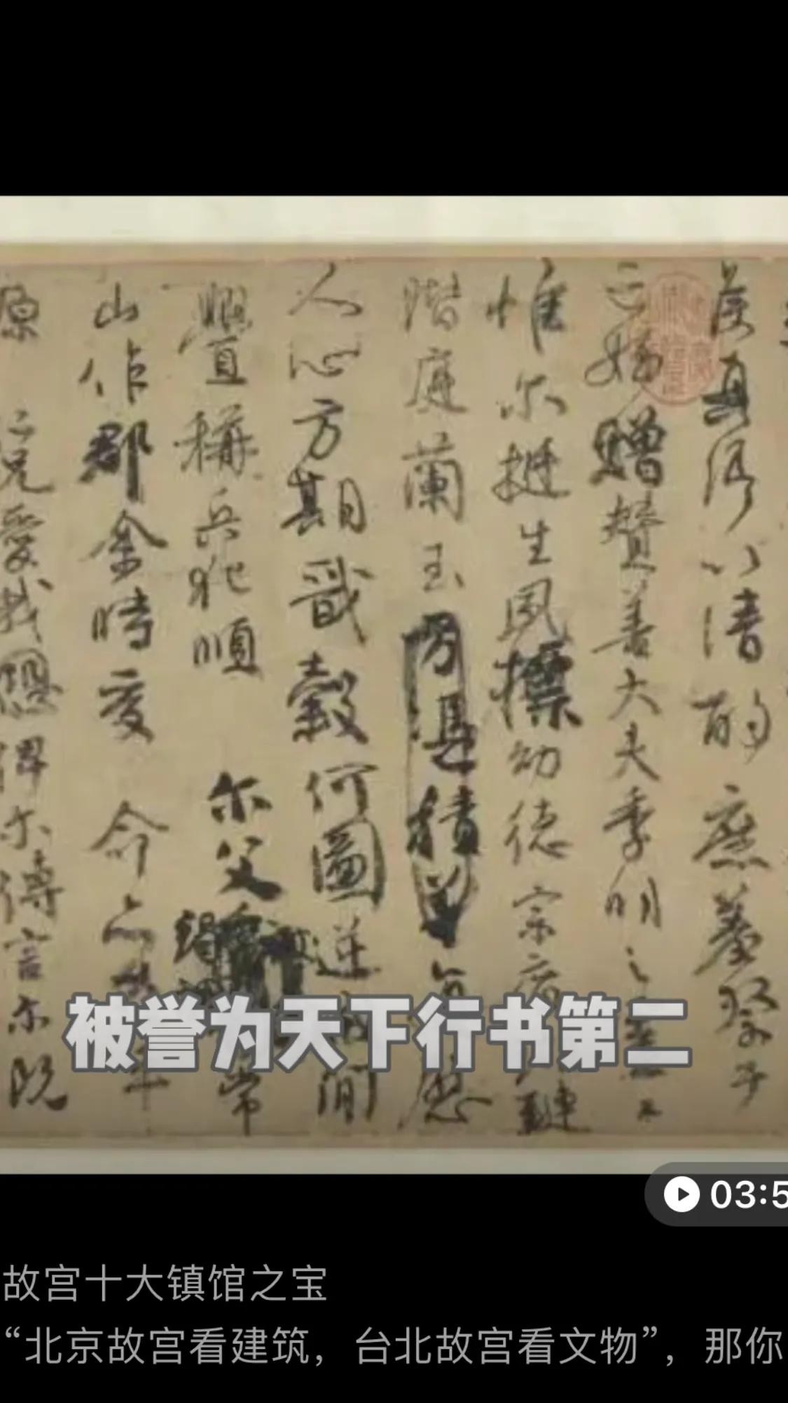 寒食帖:唐宋八大家之一,苏轼之作。台北故宫博物院共有藏品69.88万件,他们分别来自紫禁城,热河行宫,沈阳故宫,颐和园等多处皇家宝库,它们是当中的佼佼者,个个价值连城,举世罕见。希望在不久的将来,能一睹它们的真容……