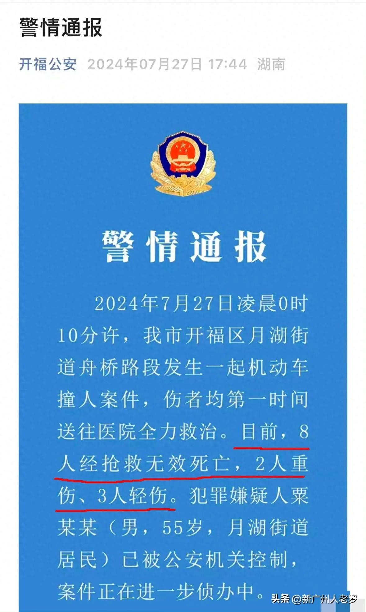 7月27日,长沙警方公布了一辆汽车撞人案!截至目前,已经8死5伤!其中2人重伤,3人轻伤!