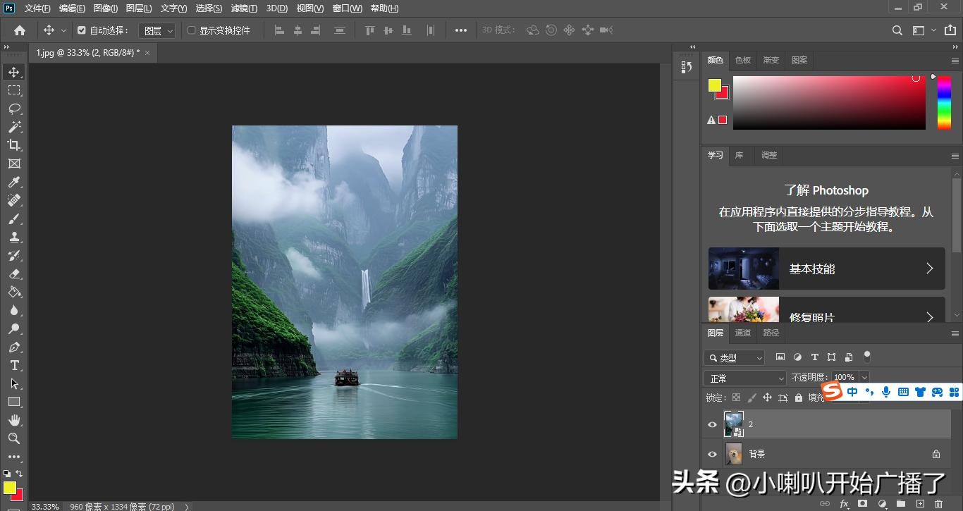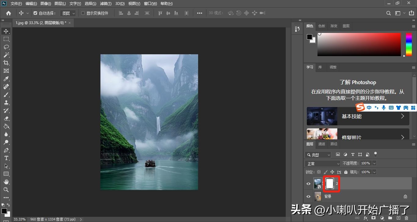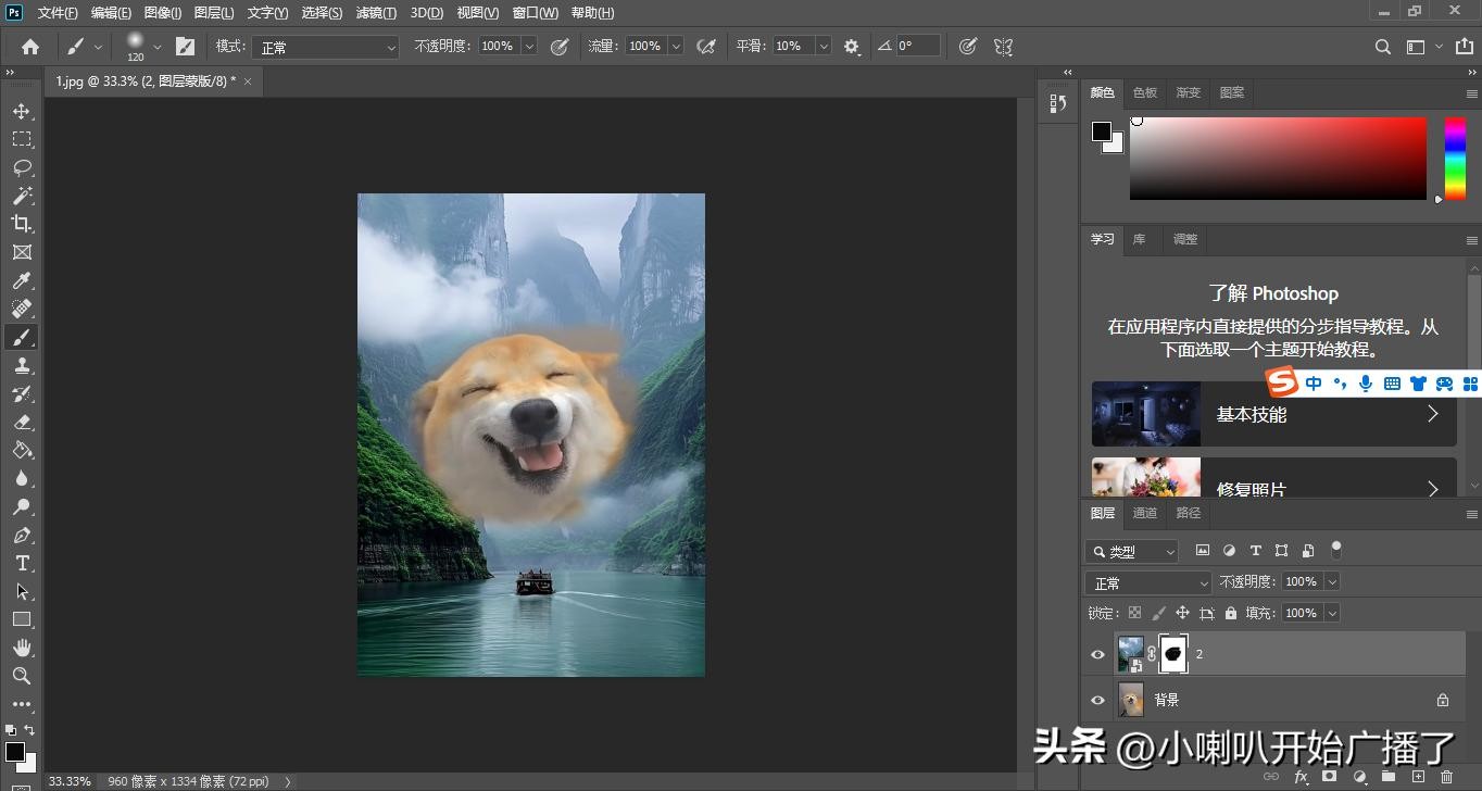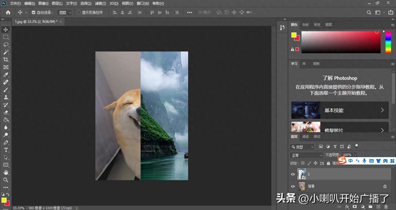假设想让底层图片中的狗显示到上层的风景图片中,如下图,如何使用PS蒙版实现?