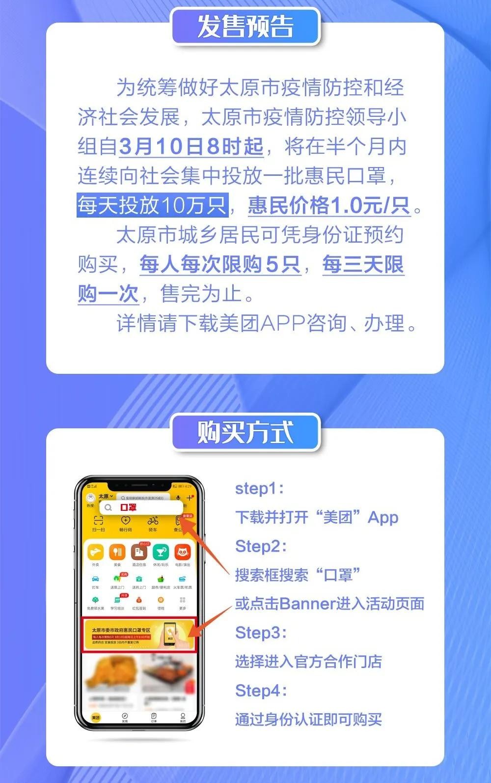 今日起,太原市民每天上午8时可登录美团APP订购口罩,每位市民3日内可购买一份,一份包含口罩5个,当日限额售完系统将自动关闭。领取方式包括美团免费配送和药店自取两种。
