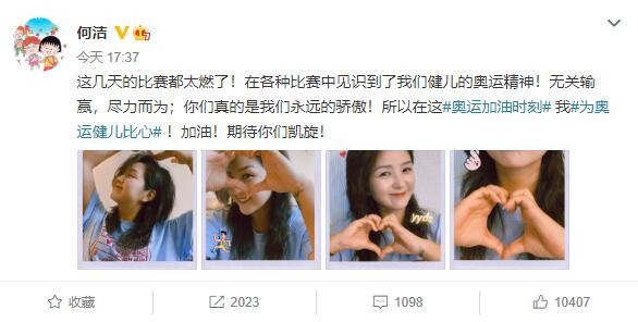 7月31日,何洁在社交平台晒出一组比心照,为我国奥运健儿加油鼓劲,并附文:“这几天的比赛都太燃了!在各种比赛中见识到了我们健儿的奥运精神!无关输赢,尽力而为;你们真的是我们永远的骄傲!所以在这奥运加油时刻,我为奥运健儿比心!加油!期待你们凯旋! ”照片中的何洁心情大好,摆出各种比心姿势,脸型圆润可爱,还俏皮为自己p图“夺冠”“yyds”!