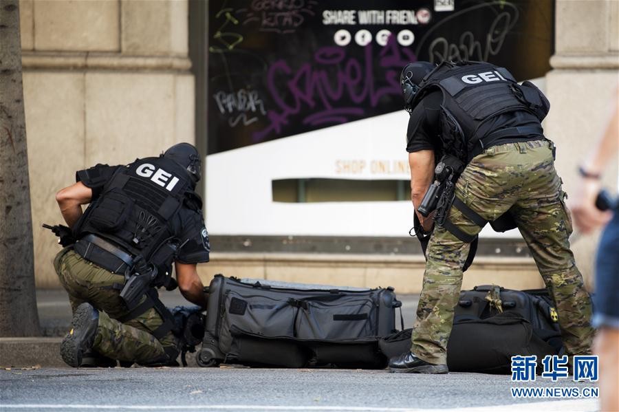8月17日,在西班牙巴塞罗那,特警在发生汽车撞人恐怖袭击事件现场附近执勤。西班牙警方17日说,该国东北部旅游胜地巴塞罗那市当天发生汽车撞人恐怖袭击事件,造成至少1人丧生、32人受伤。新华社发(利诺·德瓦利耶摄)