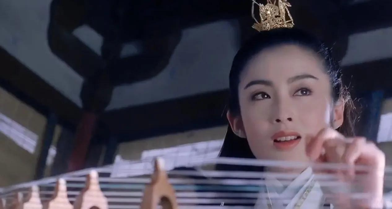 换了一身姑娘妆的赵敏在亭下弹奏等着张无忌