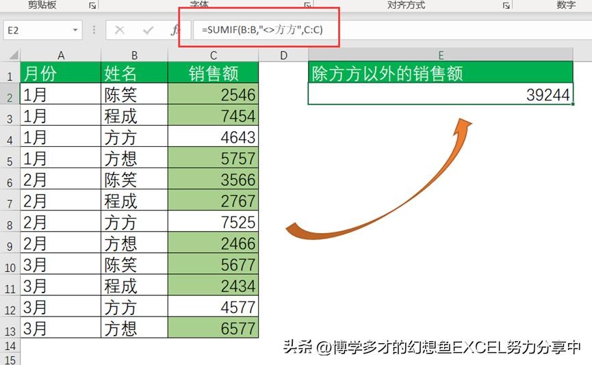 公式 =SUMIF(B:B,"<>方方",C:C)