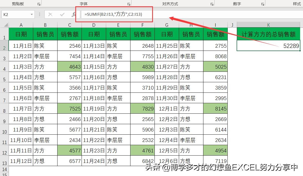 公式 =SUMIF(B2:I13,"方方",C2:I13)