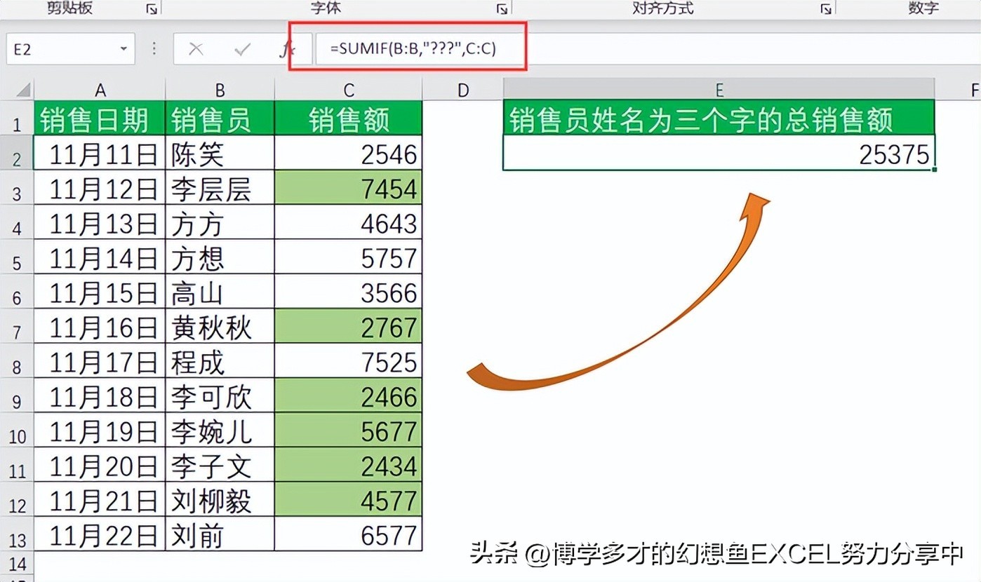 或 =SUMIF(B:B,"???",C:C) (图二)
