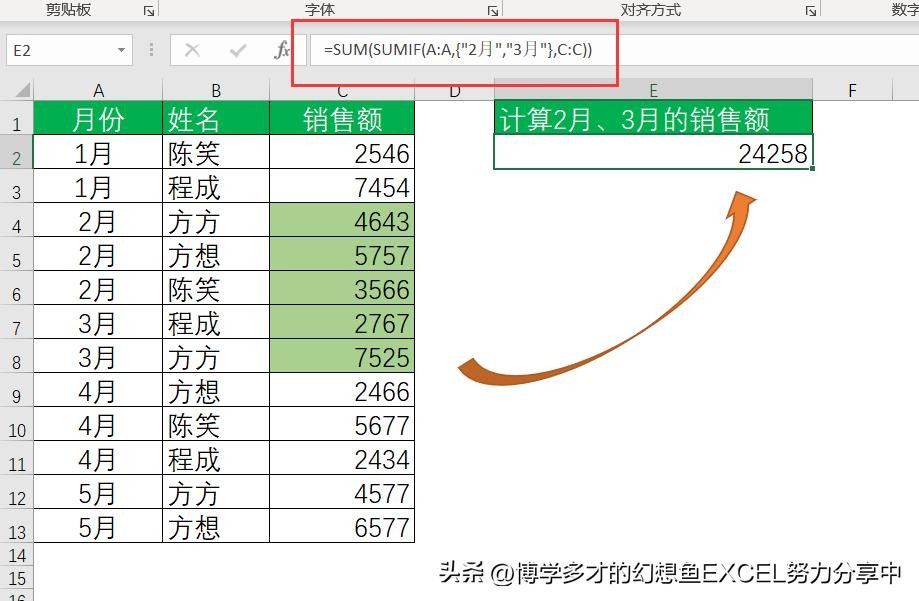 公式 =SUM(SUMIF(A:A,{"2月","3月"},C:C))
