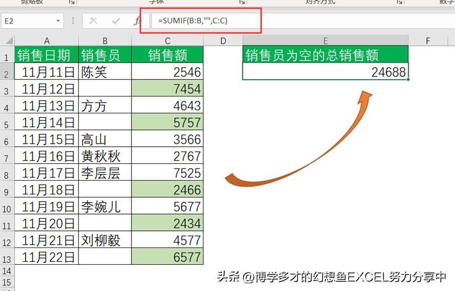 公式 =SUMIF(B:B,"*",C:C)(图一)