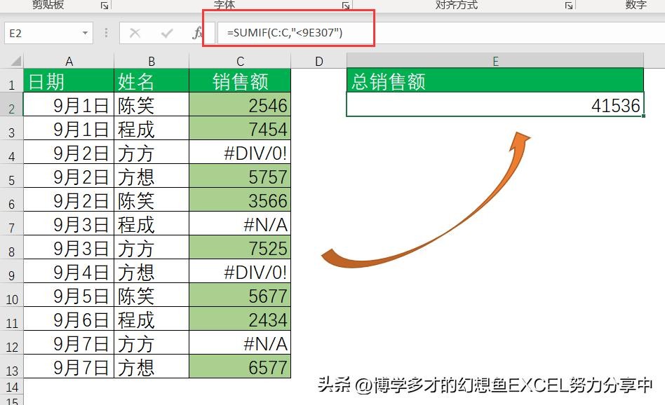 求和参数省略,以条件区域C:C作为求和区域,9E307完整的表述是9E+307,在EXCEL中属于科学计数法,表示9*10^307,是一个非常接近Excel能够容纳的最大数值的数值,求和条件是<9e307,相当于对所有数值求和。