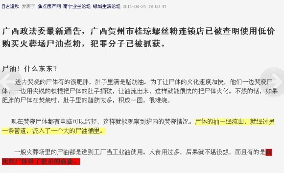 有网友在网上发帖,说广西的某家螺蛳粉因为购买火葬场的尸油煮成粉,现已被抓获。