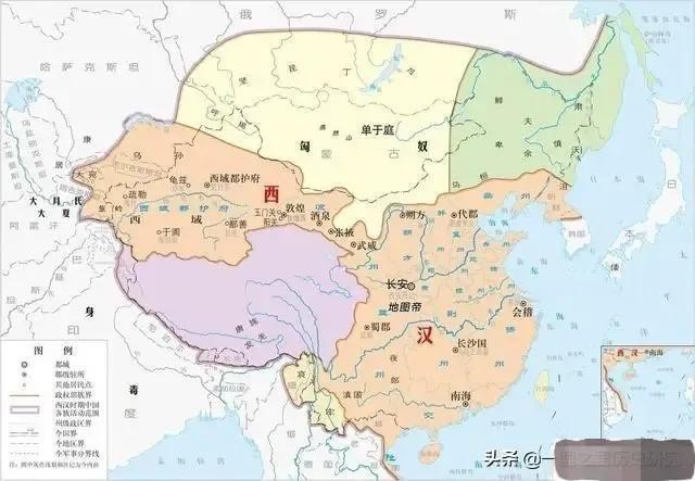 图66,西汉、匈奴疆界示意图。那时,贝加尔湖是汉人眼中的“北海”、“瀚海”,苏武北海牧羊,霍去病饮马瀚海。