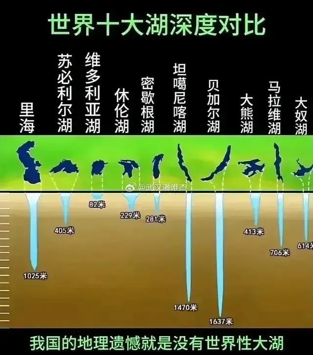 图50,世界十大湖深度对比。贝加尔湖以1637米排名第一。
