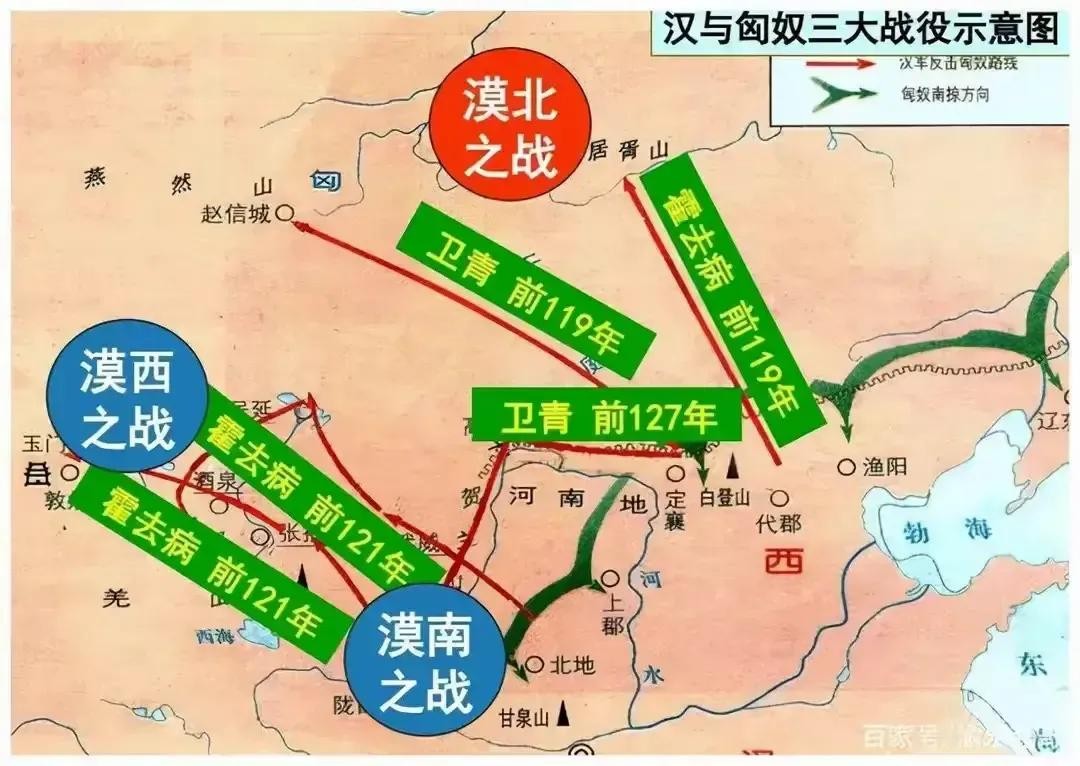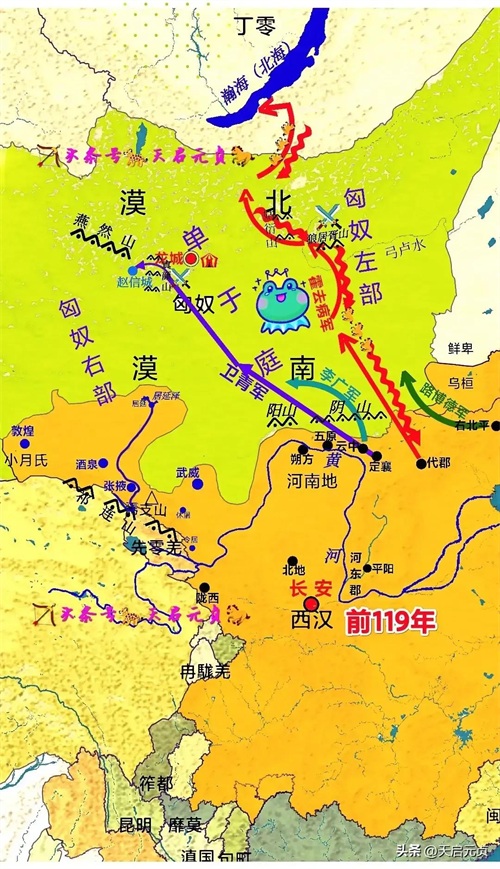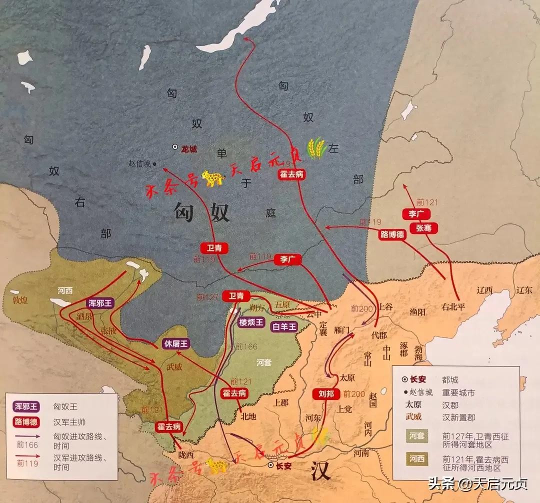 图64,汉武帝时,帝国双璧北击匈奴行军路线图。打到贝加尔湖那一条线就是冠军侯霍去病,打到了龙城、赵信城那一条线就是长平侯卫青。