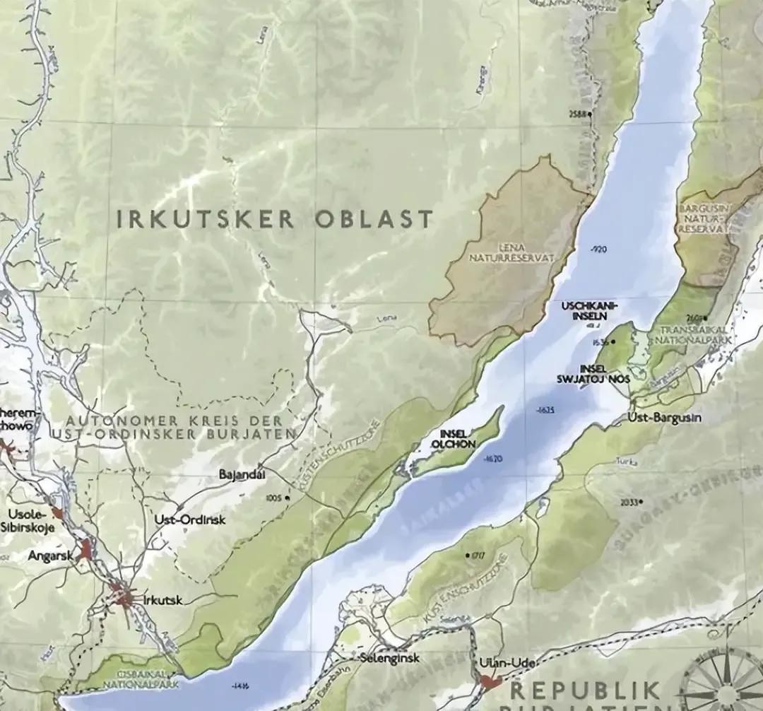 图35,贝加尔湖北面是伊尔库兹克州,南面是布里亚特共和国。