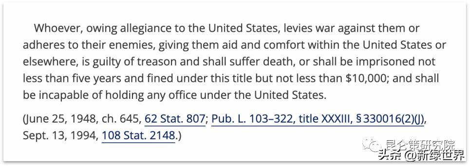 值得一提的是,这种朴素的情感并不仅限于中国。《美国法典》第18编至今留着一条:“对美国发动战争、或追随美国的敌人、或向其提供资助的人即犯‘叛国罪’,应处死刑,或处不少于5年监禁并处不少于10000美元罚款。犯此罪者不得在美国担任任何公职。”