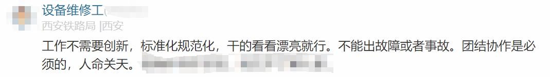 西安铁路局员工原话:工作不需要创新,标准化规范化,干的看看漂亮就行。不能出故障或者事故。团结协作是必须的,人命关天。