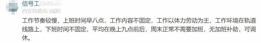 西安铁路局员工原话:工作节奏较慢,上班时间早八点,工作内容不固定,工作以体力劳动为主,工作环境在轨道线路上,下班时间不固定,平均在晚上九点前后,周末正常不需要加班,无加班补助,可调休。
