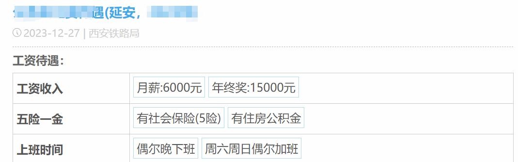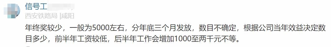 第二位自曝薪酬的,是西安铁路局的员工,他的月薪是6K,年终奖1.5W,偶尔晚下班,周末偶尔加班。