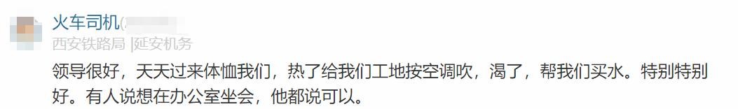 西安铁路局员工原话:领导很好,天天过来体恤我们,渴了,帮我们买水。特别特别好。有人说想在办公室坐会,他都说可以。