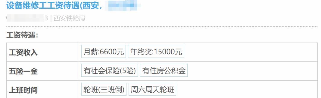 第二位自曝薪酬的,是西安铁路局的设备维修工,他的月薪是6.6K,年终奖1.5W,轮班(三班倒),周末轮班。