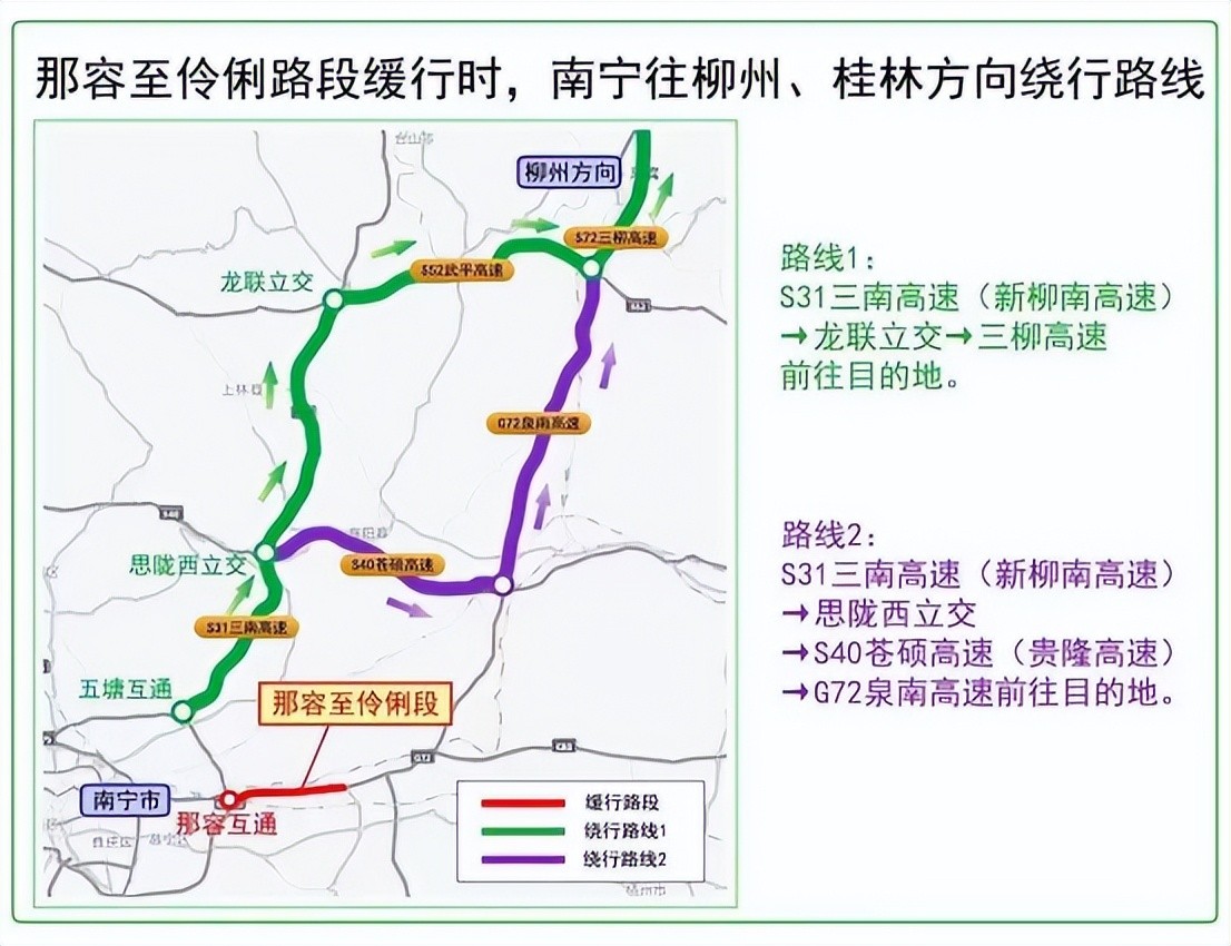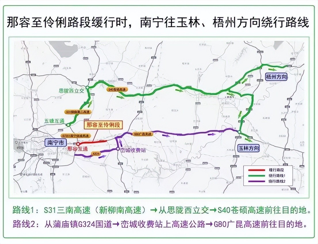 路线2:从武鸣、伊岭岩收费站出站避开拥堵路段,绕行南武城市大道进城;或者是绕行037县道,走邕武路进城。