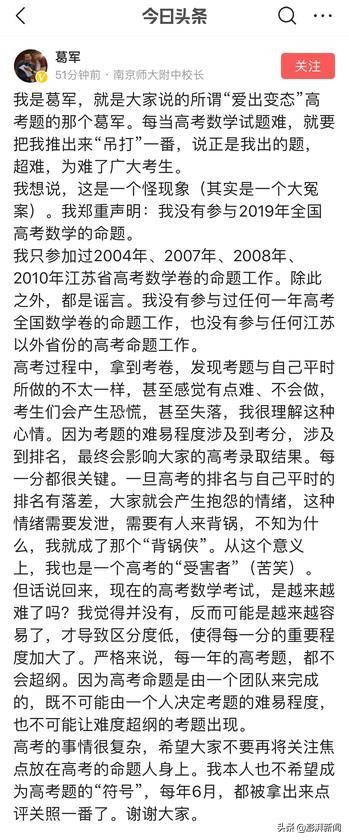 葛军表示说:“我是葛军,就是大家说的所谓‘爱出变态’高考题的那个葛军。每当高考数学试题难,就要把我推出来‘吊打’一番,说正是我出的题,超难,为难了广大考生。我想说,这是一个怪现象(其实是一个大冤案)。我郑重声明:我没有参与2019年全国高考数学的命题。”