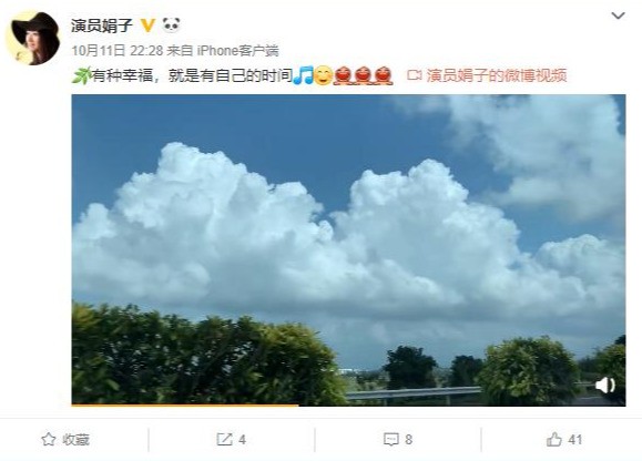10月份,娟子乘车来到海南三亚。10月11日,娟子发文说"有种幸福,就是有自己的时间",还上传了一段视频,视频里车子在公速公路上飞奔着,车窗外的树木一闪而过,蓝天白云,让人心情格外地舒畅。