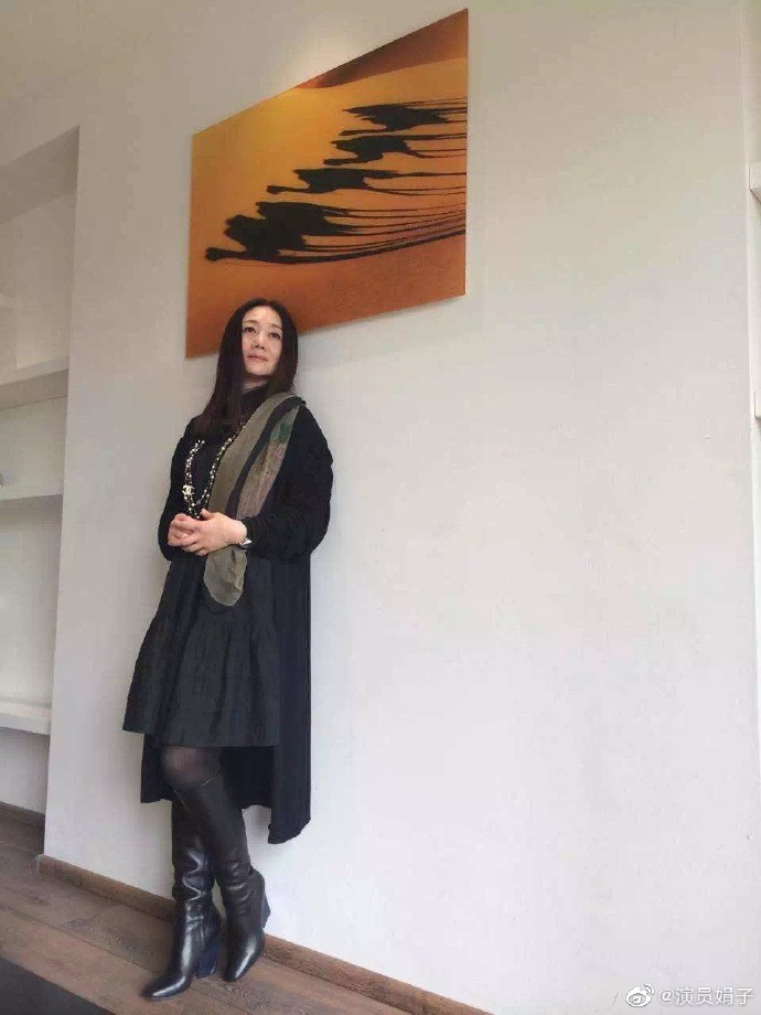 许久未曾露面的娟子,一身黑色系,黑色长筒靴子搭配黑色公主裙,最外面穿着一款黑色长大衣,留着过肩长发,斜靠着一面墙,妆容清淡,气质优雅,脸上毫无皱纹,丝毫没有岁月的痕迹,犹如22年前一样。