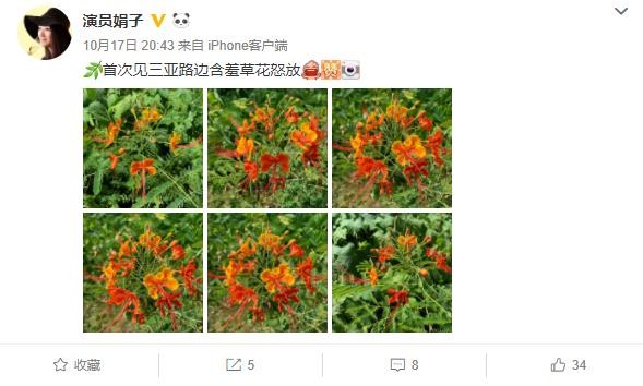 5天后,娟子发文称"首次见三亚路边含羞草花怒放",同时还晒出6张照片。
