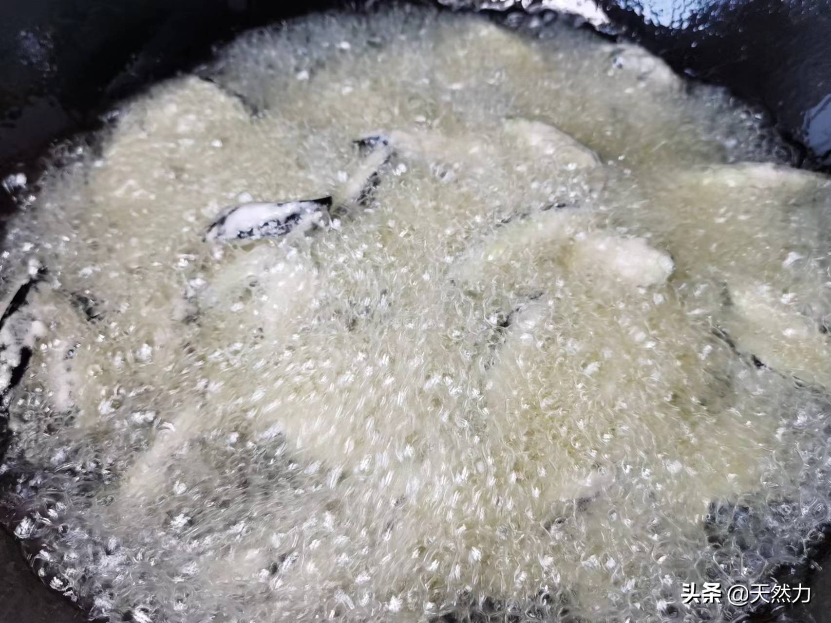2、用手勺(锅铲)把粘在一起的茄子分开,这样受热才更均匀。茄子在炸制的全程我们都可以用大火,保持一个高油温来炸制。
