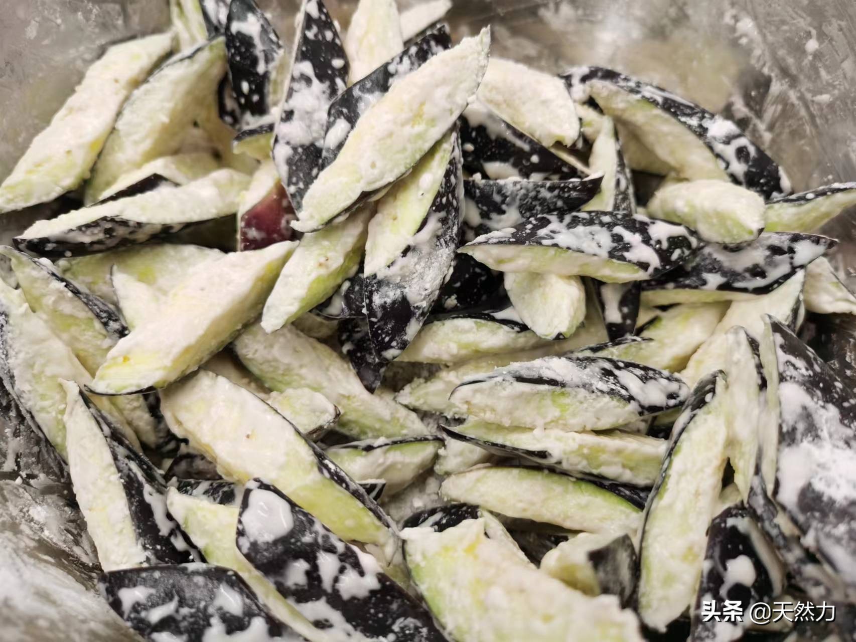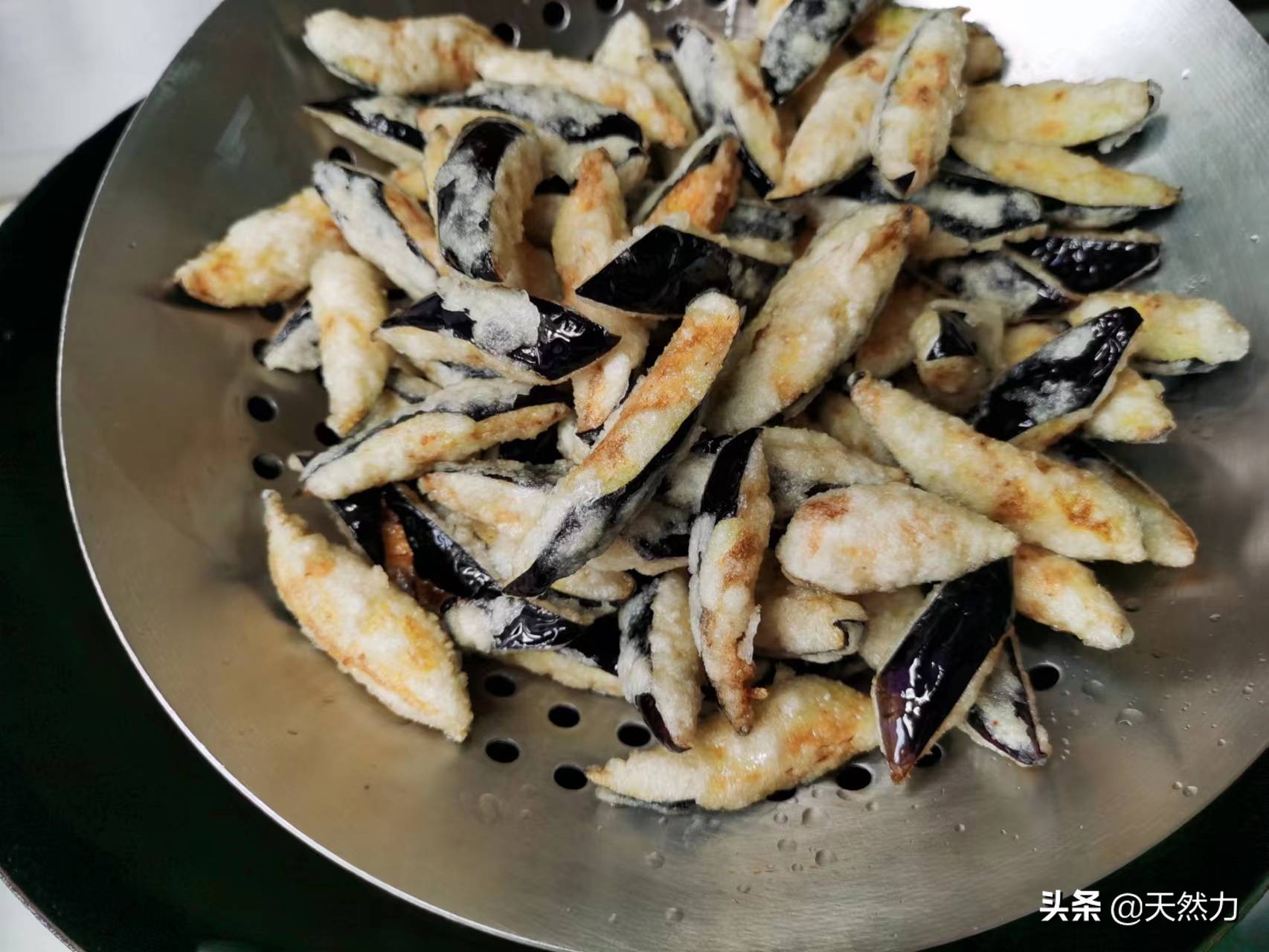 12、如此3次操作,茄子就均匀地,牢固地挂上了淀粉,这时的茄子应该是完全地被淀粉给包裹了,相互也不会有粘连的现象,然后把茄子倒进漏勺,把挂好粉的茄子过筛,把粘得不牢靠的淀粉过筛掉。然后放在一旁备用。