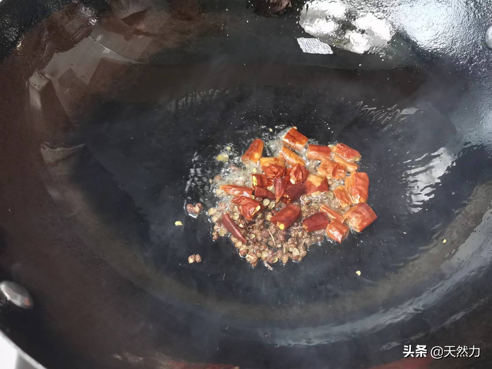 4、把炸茄子的油倒出只留30克的余油, 然后把花椒和干辣椒段倒入锅内,因为锅和炸过茄子的油都是刚用过的,所以温度还是比较高的,所以花椒和干辣椒段下锅后很快就能出香味。