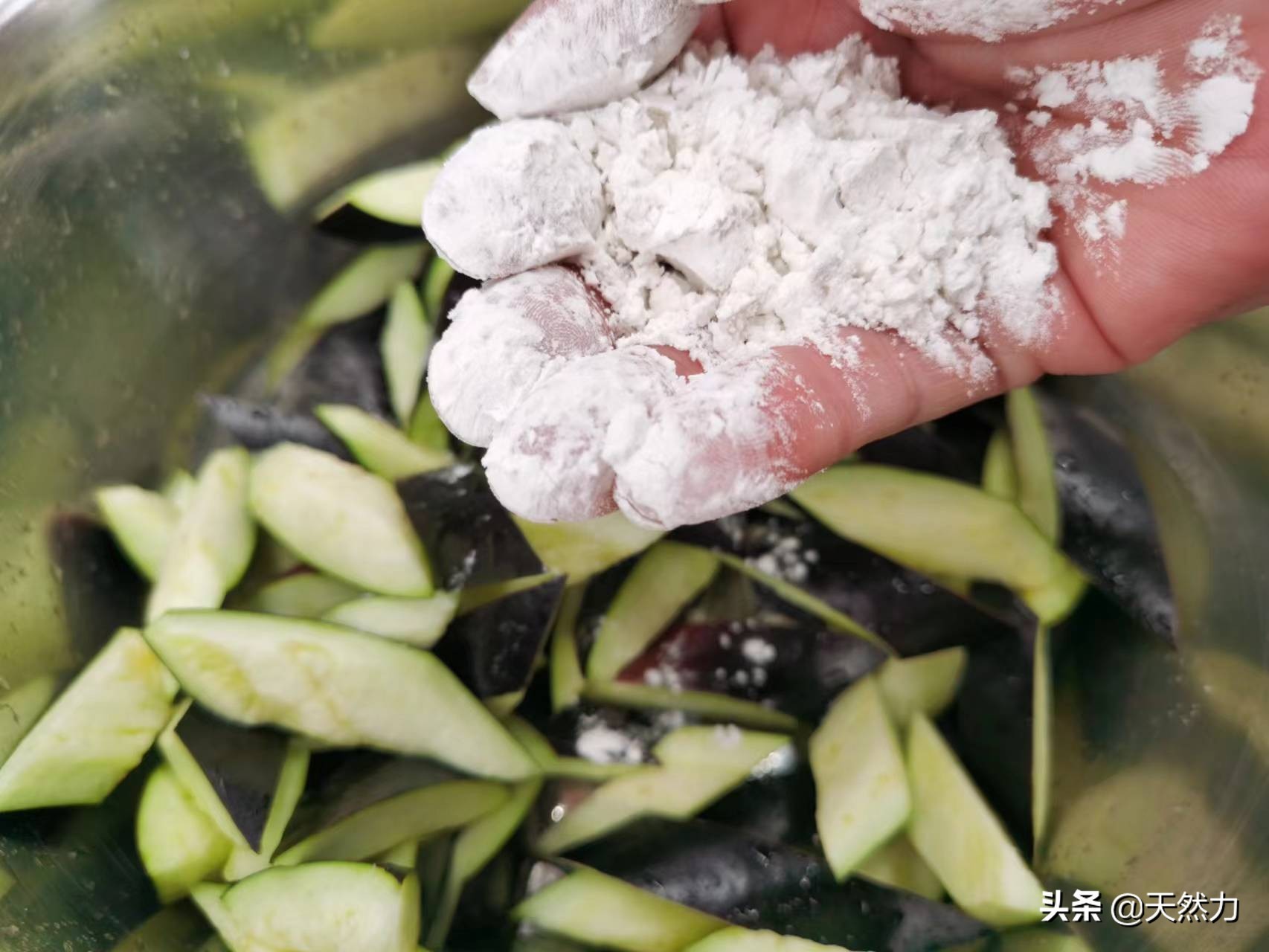 10、把盐搅拌均匀后,抓上半把淀粉均匀地撒在茄子上面,然后用手捞拌均匀,让淀粉均匀地挂在茄子上面。