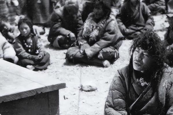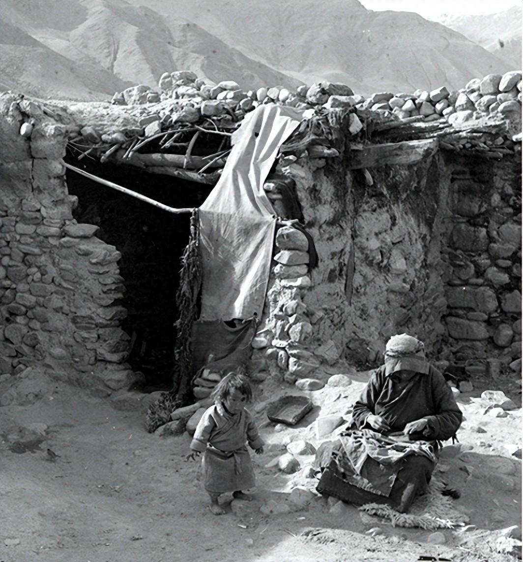 照片中一位母亲正坐在“家”门口缝补衣服。解放前的西藏,