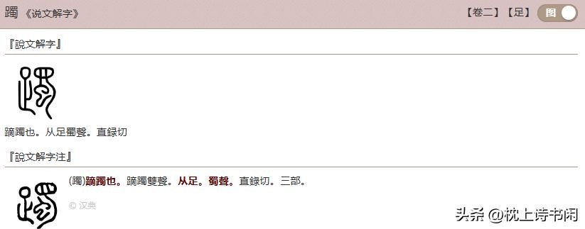 释 义:以足击地,顿足;慢走