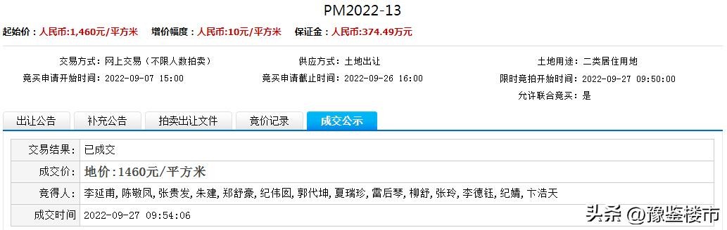 13号地块9月27日网拍,以起始价成交,每亩地价为97.33万元,楼面地价为973元/㎡,被李延甫、陈敬凤、张贵发、朱建、郑舒豪、纪伟囡、郭代坤、夏瑞珍、雷后琴、柳舒、张玲、李德钰、纪婧、卞浩天共计14个自然人联合竞得。