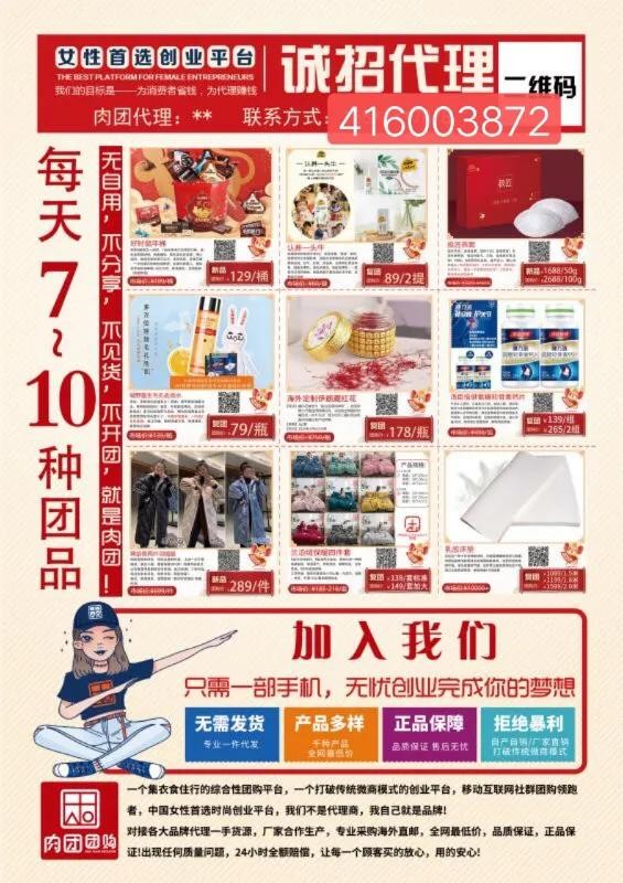 肉团打破了传统微商的层层代理、层层压货升级的商业模式、无需囤货发货、每日不同爆款开团、*的创业模式,只要开团就有收入,想做微商,一定要从肉团开始!相信少走弯路,是很多人想要的。肉团这点实现了,不需要你再找商品,不需要你去打包,不需要你被人忽悠交代理费,去囤货,这是很多微商小白想走的捷径。妮子V:416003872