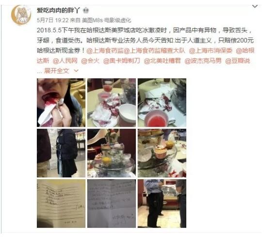 近日,一网友在微博曝出,自己在上海的哈根达斯美罗城店吃冰淇淋,结果舌头、牙龈都被弄破,受了伤……