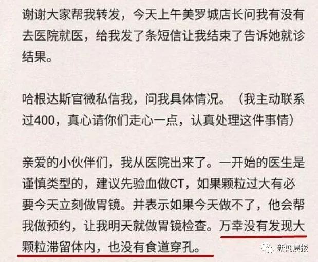 哈根达斯:我们现在还在了解事件具体情况。我们在现场查看餐具未见破损,没有见到异物,在现场、医院的检查中都没有见到异物。但是,本着对消费者的重视和关爱,当天哈根达斯门店工作人员在第一时间陪同消费者到医院进行了检查,并支付了相应费用。