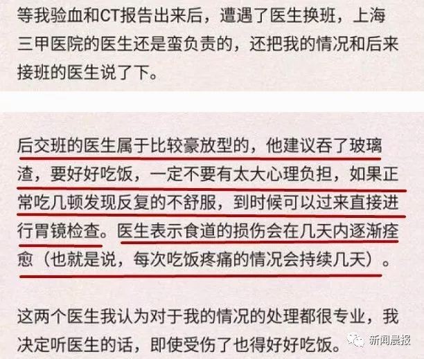 经过检查,所幸没有食道穿孔,但医生建议继续观察,一旦不适立刻进行胃镜诊疗。