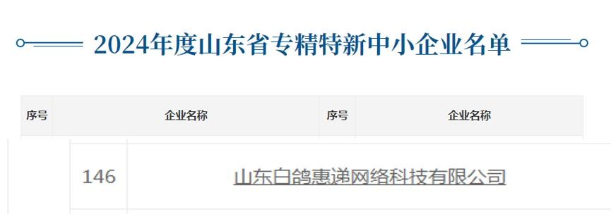 近日,山东省工业和信息化厅公布了2024年度的“专精特新企业”名单,白鸽惠递凭借其卓越的专业实力和创新精神,成功入选为山东省2024年度的“专精特新”企业。