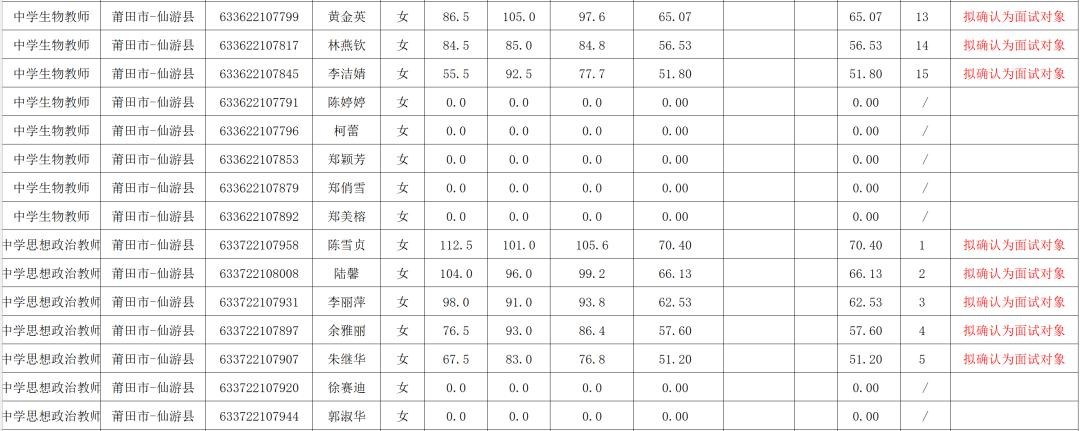 现将仙游县2022年中学、小学、幼儿园新任教师公开招聘考试考生笔试成绩、奖励加分及面试对象等情况公告如下: