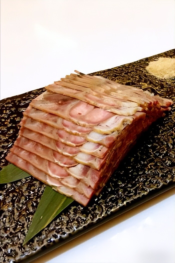 它之所以叫做手切后腿肉,是因为它必须由餐馆服务员手工肌切而成,顾客点菜时会拿出后腿上的一块猪肋条并用武士刀将其均匀地切成薄片放入到酱汤中。