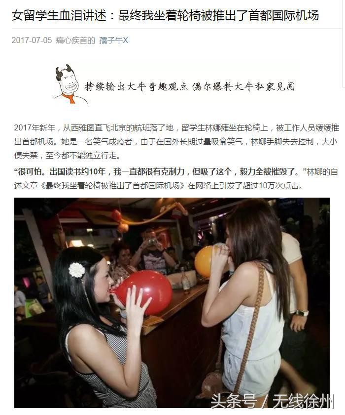 近日,一篇网文令人震惊。文章以一个在美国西雅图留学的学生的口吻,讲述了该留学生由于吸食笑气成瘾,最终大小便失禁,脑神经受损,出现痴呆、健忘甚至产生幻觉等症状,无法完成学业,最终,坐在轮椅上回国。一时间,“笑气”的危害性才真正为公众所警惕。